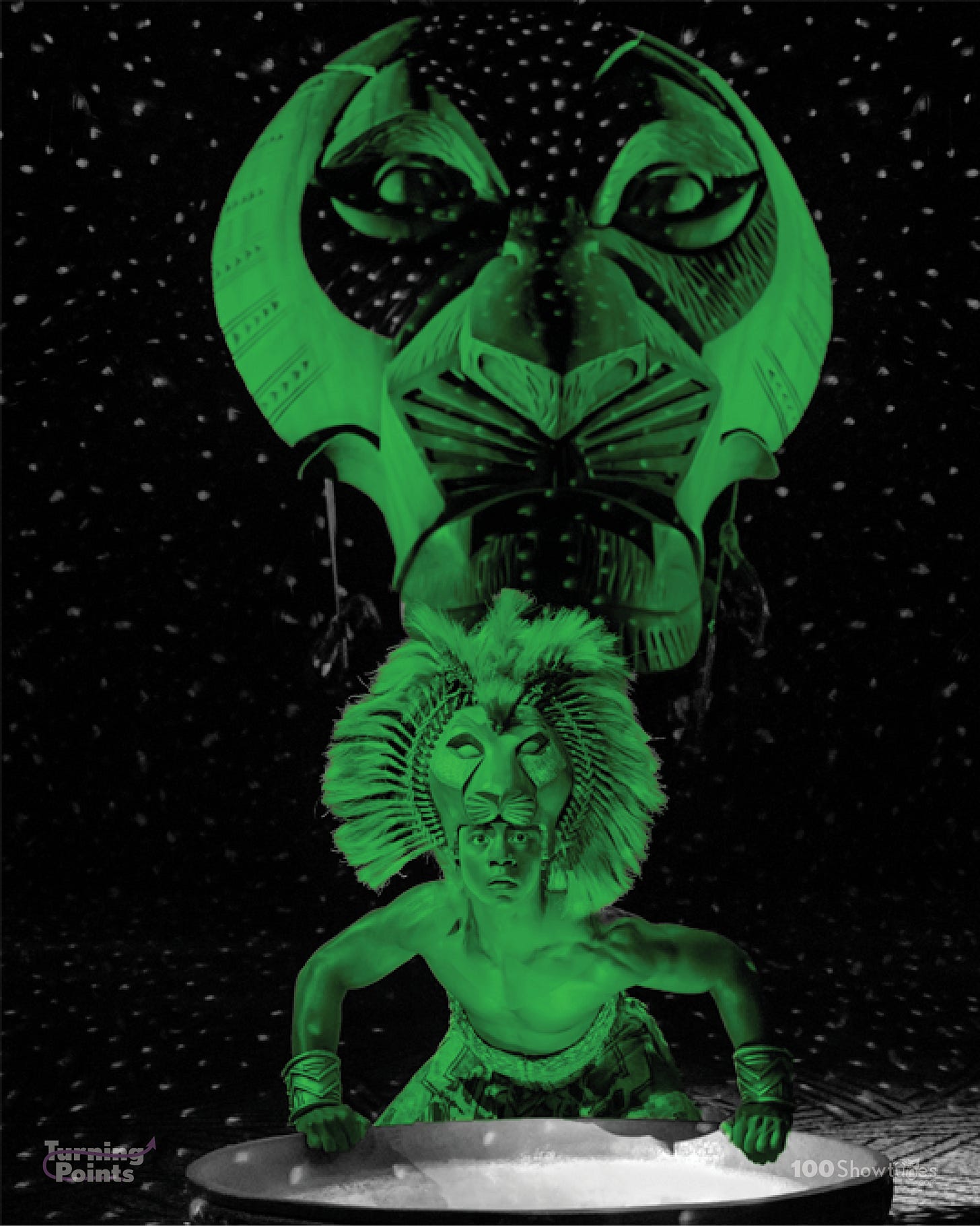 December 1997. You’ve entered a newly re-opened Broadway theater in a recently de-sleazed Times Square to see the latest Disney musical. The lights come up on Rafiki, a baboon but also a sort of witch doctor with stylized makeup. As she starts to sing “The Circle of Life,” a huge paper sun rises from the stage. Then two giraffes—actor/puppetts hunched over on stilts—slowly enter in front of the rising sun, and it’s a stunning image. Soon other animals—gazelles, birds, a friggin’ elephant!—start entering from the wings and down the aisles. But there’s no fur on the stage—all animals are created with a mix of masks, puppetry, and African apparel that allows the characters to be fully human. And the puppetry is nothing like the Muppets—these are ingenious creations with visible operators capable of expressive movement. The production follows the popular movie closely, but the score is supplemented by additional music with lively choral arrangements that help turn the evening into a celebration of African culture. In Act 1, Mufusa (the king of Pride Rock) sings “They Live in You” to teach young Simba (his impatient son) about the spiritual ancestors that guide them through generations. By Act 2, Scar (Mufasa’s jealous brother) has killed the king, and Simba has grown to adulthood in exile. Rafiki finds Simba and encourages him to return to Pride Rock to defeat Scar signing “He Lives in You (Reprise).” The number is staged in dim lighting as Rafiki tries to conjure Simba’s ancestors. The ensemble gracefully weaves in and out of the background carrying what appear to be large flagpoles of some kind before coming together to reveal a large Mufasa head, that gives Simba words of encouragement. After a brief scene in which Simba agrees to reclaim his rightful place as ruler, the stage is suddenly washed in color and light as the company—many of whom are now in African human-clothing sans animal puppetry—sings a joyous final refrain.